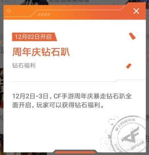 12月2日-3日期间,CF手游周年庆暴走钻石趴全面开启,玩家可获得钻石福利。