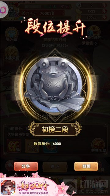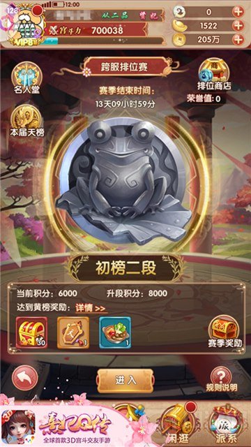 根据排名的从低到高,跨服排位赛共设置初傍、黄傍、玄榜、地榜和天榜。其中,初、黄、玄、地四榜各包含5个小段位。而让人垂涎的天榜共设有100个名额,只有在地榜中积分最高的人中龙凤才有望进入天榜,享受无上荣耀。