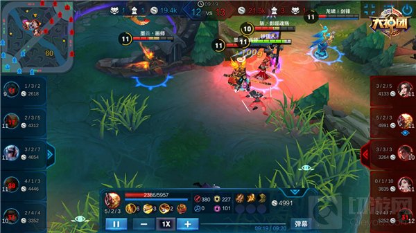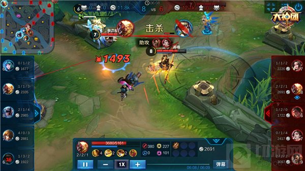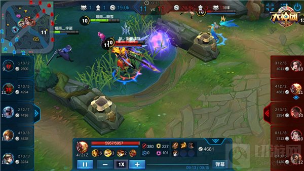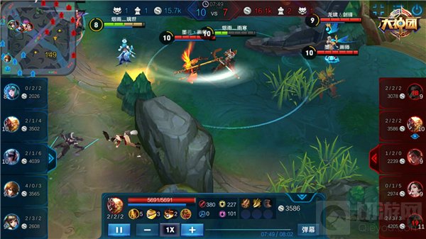 吕布开启大招跳入敌阵中,利用技能1、2群攻敌人并为自身增加护盾,结界还可以减速敌人的移动速度,防止敌人逃脱;孙悟空在吕布开大的时候突进上前,使用召唤师技能晕眩和大招,将敌方后排单位打到前排,并随时通过隐身技能脱离战场。