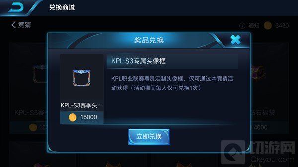 KPL S3专属头像框使用15000个竞猜币可以兑换,这个竞猜币来得非常容易,系统也会赠送很多,这个头像框基本上是每位玩家都能兑换到手的一个小福利。