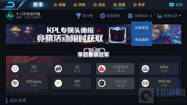 兑换指南:游戏主界面——赛事——竞猜——兑换奖品(先领竞猜币)