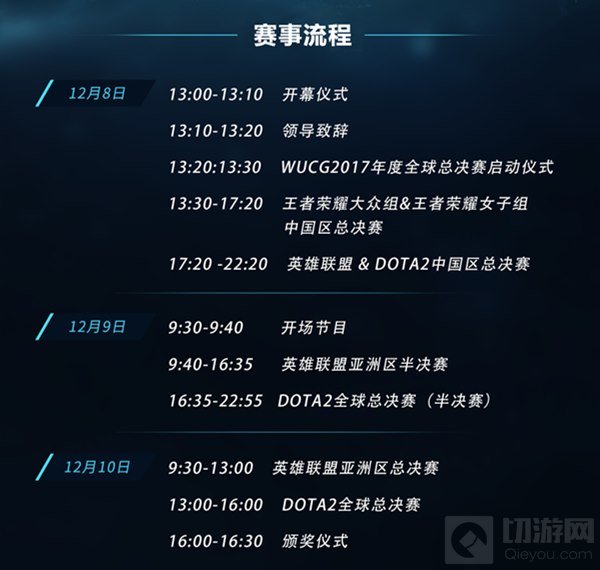 WUCG2017全球总决赛由山东广电传媒集团、山东体育总会、章丘区人民政府、上海高竞文化传媒有限公司主办,山东广电电竞文化传媒有限公司、齐鲁置业有限公司、山东艾美体育联合承办。12月8日至10日,WUCG全球总决赛将在中国山东济南举行,届时《DOTA2》、《英雄联盟》、《王者荣耀》三个项目将决出最终的冠军。