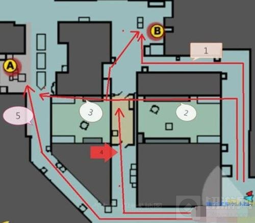 上图给大家标记出来的四条路线都是潜伏者进攻A、B包点的路线,进攻A包点的路线分别为3/5,进攻B包点的路线则是1/2/4,那么下面就详细给大家讲解一下这五条路线。