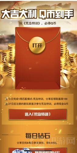 在“大吉大利,Q币到手”活动中,玩家每日完成1局匹配模式-荒岛特训,分享红包即可领取最高188Q币的奖励,还能得到8-88不等的钻石福利,100%必得!只需匹配1局,大量Q币、钻石唾手可得,何乐而不为呢?此外,11月27日后注册的新玩家首次参与荒岛特训,100%必得现金+Q币+钻石奖励,福利可谓惊人。