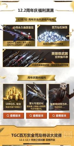 在CF手游双周年庆典期间(12月1日至12月7日),玩家们还能参与“大吉大利,Q币到手”、“掌火专属好礼”两大福利活动,Q币、钻石、英雄级武器100%必得,更有现金奖励!