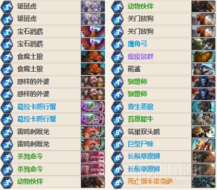 这一套牌很重要的特点是职业牌占到了90%,野兽十分多,这使得这套不带龙胖和马的猎人变得十分顺滑(不卡手),使用这套卡杀戮基本都可以打5,驯兽师也好用的多,雷鸣斥候龙成为亮点。这套牌胜率有60往上走。