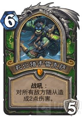 死亡猎手雷克萨,这是一张让这套卡组充满了丰富的娱乐性和无限可能的英雄牌。同时也是这套亡语中速猎的第三张“过牌”,强力的战吼增加了猎人的解场能力,面对极致形态的快攻卡组,死亡猎手雷克萨那五点护甲甚至可以救命。但是由于对场面帮助不大,进攻时会很无力,一般情况起手不留。另外僵尸兽中很强的牌有:小野猪,幼龙鹰,坨运科多兽,金手指,鼠疫,以及各种墙等。