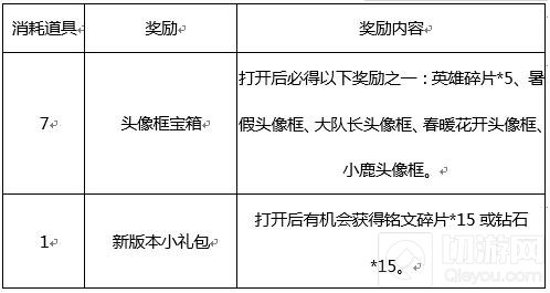 惊喜礼盒:打开后有机会获得以下奖励之一:钻石*666、英雄碎片*1、英雄碎片*2、钻石*10、铭文碎片*10。