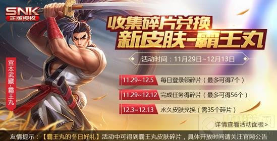 2、11.29~12.12参与【霸王丸】集碎片换皮肤活动,每日可获得4个,最多可获得56个;