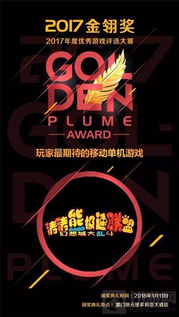 备受业界瞩目,被称为游戏界的“奥斯卡”的2017金翎奖年度优秀游戏评选大赛已经揭晓最终得奖结果。由分享时代发行的《涛涛熊极速联盟—幻想城大乱斗》荣获2017金翎奖“玩家最期待的移动单机游戏”奖项。
