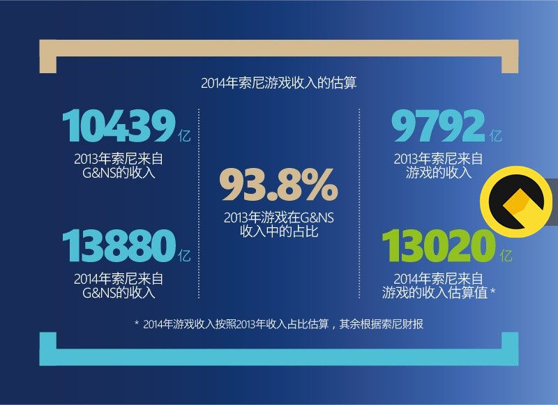 看起来并没有赶超?这是因为Newzoo报告中的索尼游戏收入是估算值,而且60亿美元(约合372亿元人民币)的估算值也实在太看不起索尼了。在索尼刚刚公布的年报中,游戏收入没有单列,而是合并在“游戏与网络服务”(Game & Network Services,G&NS)中作为整体公布收入数字。在截止2015年3月31日的这个财年,索尼来自游戏与网络服务的收入为13880亿日元(约合719亿元人民币),按照上一个财年索尼游戏收入在G&NS中的占比,我们估算出索尼的游戏收入应该在13020亿日元(约合675亿元人民币)左右,仍旧比腾讯高出许多。一个可能的假设是,Newzoo在估算时减去了索尼游戏收入中硬件的部分——索尼在上个财年卖出了1790万台PS系设备,这一部分的毛收入至少有360亿元人民币。看来,腾讯吃亏吃在了没有发售主机?