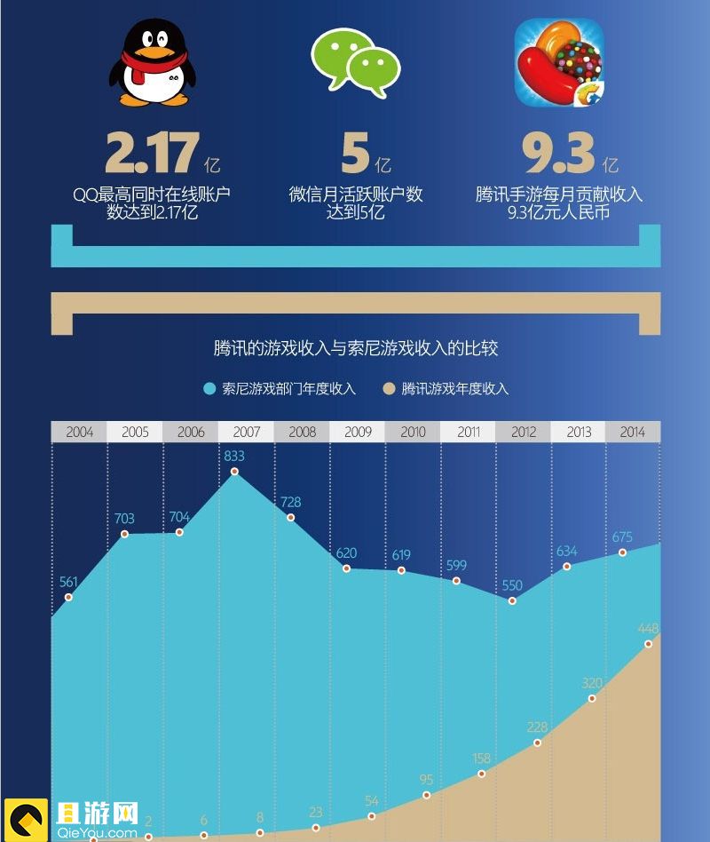 市场调查机构Newzoo发布的2014年游戏公司收入报告显示,腾讯压倒索尼成为去年全球收入最高的游戏公司。似乎没有人对此感到意外,因为Newzoo早在2013年的一些调查报告中就指出,全球最大的游戏公司不是暴雪,不是微软,也不是任天堂,而是腾讯。从2004年上市时年收入十多亿元人民币的“小企业”发展成了全球顶尖的互联网公司,按照腾讯的发展速度,这个结论完全有可能是正确的。