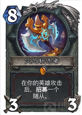 战士传说武器。倒数第二发布的传说武器,想象之中应该更强。从牌面效果来看和萨满武器属性一样费用偏高,招募效果也并不稳定,可能很多人认为并不强,但是我认为是完全对的起这个排名的。首先牌面价值3攻3耐久,值三费左右。