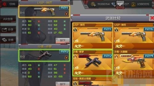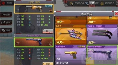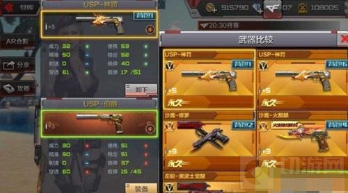 USP伤害方面自然是不如沙鹰系列的,别说神器了,USP再增强也不能比普通的沙鹰伤害高。由属性对比图可以看出,USP—神罚与沙鹰—修罗对枪的话,只能依靠精准高这一特点了。敌方打两枪而自己可以打三枪,更快速且更精准的命中敌人,这就算是一点小优势了吧。