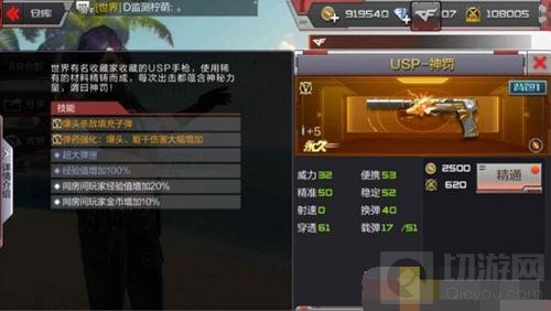 作为USP家族的第一把神器,自然不能像建号赠送的USP那样鸡肋了。这把USP—神罚威力32、便携53、精准50、稳定52、换弹40、穿透61、载弹17/51,爆头杀敌填充子弹,爆头、躯干伤害大幅增加。