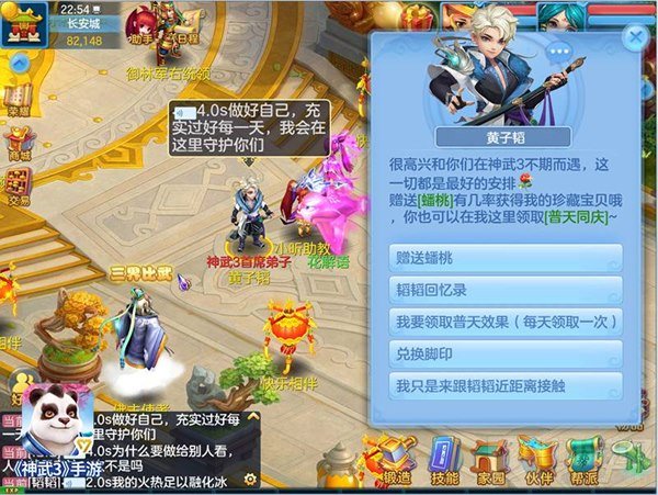 黄子韬=新服火爆开启,韬师兄入驻长安城,玩家粉丝们可以在此体验到海浪手札、赠送蟠桃、参与韬韬回忆录活动、领取普天同庆BUFF、兑换珍藏脚印等定制互动玩法。想要和韬师兄近距离亲密接触吗?点击黄子韬NPC对话框聊天按钮就可以与韬师兄实时聊天,更能倾听他的声音和故事。