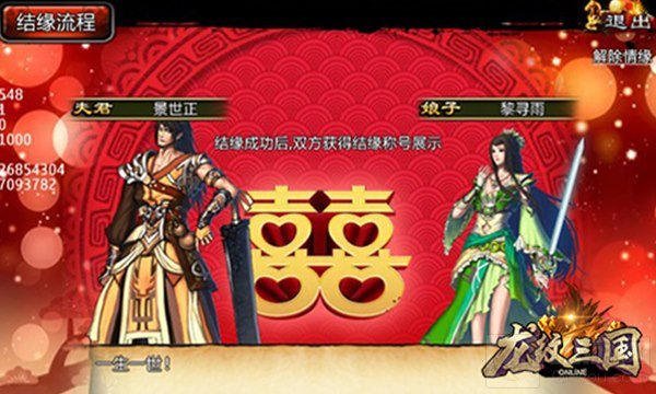 萧随琴,琴随萧,天作之合两相依。《龙纹三国》情缘系统正式上线,为金戈铁马的乱世之中带来一丝甜美浪漫气息。主公们手执情缘信封,互送情缘玫瑰,即可与心仪对方结为连理。成功结缘的玩家还会拥有情缘专属称号,快来寻找属于你的情缘吧!