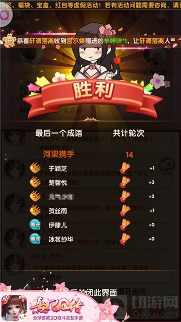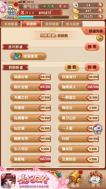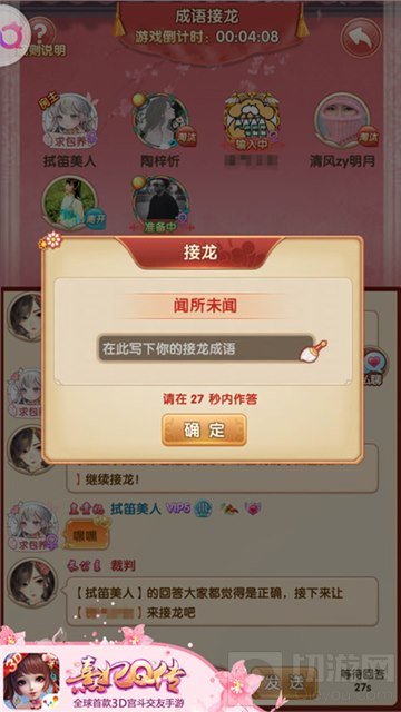 宫斗关卡通过80关的小主们,只需打开《熹妃Q传》的宫斗主界面,点击“跨服频道”—“频道列表”—“游戏频道”—“成语接龙”,就可随机加入或自主创建一个游戏房间并邀请熟识的小主一起参加游戏了。