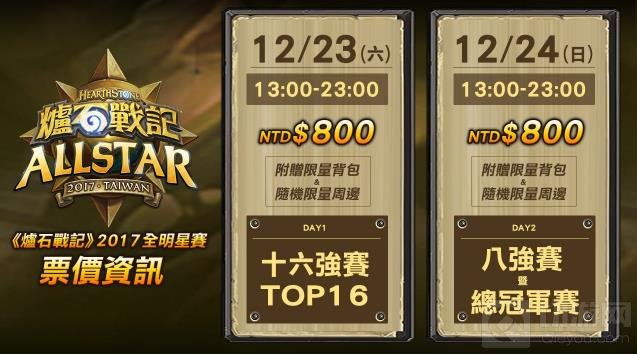 《炉石传说》2017全明星赛(Hearthstone All-Star Invitational )将于12 月 23 日(六)至 24 日(日)于暴雪电竞馆闪耀登场。顶尖《炉石传说》知名世界好手与台湾香港澳门高人气选手共16位将正面交锋,争夺最高荣耀。暴雪电竞馆将于12 月 15 日(五)晚上六时开放玩家抢购限量票;购票入场的玩家除可观赏国内外顶尖选手的精彩交锋、欣赏爵士乐团现场表演外,还可近距离与国内外明星选手近距离交流互动,以及《炉石传说》2017全明星赛限定神秘福袋,每日门票单张售价为新台币$800元,因场可容纳座位有限,赛事门票售完为止。