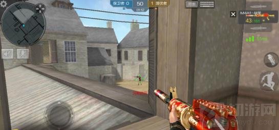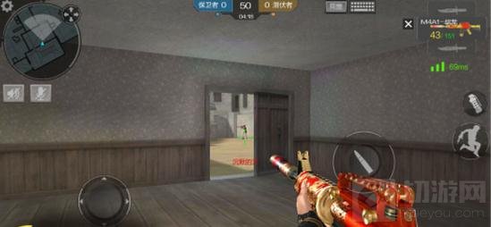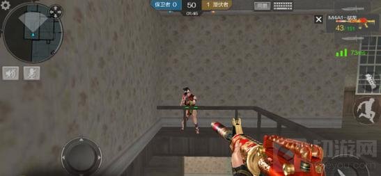 侧路下层与上层整体结构相似,但在靠近门口的位置(如图示)有木门可以做为掩体,玩家可以使用穿透力较高的M4A1系列、M14EBR系列等枪支灵活击杀敌人,也可躲在墙角处给敌人出其不意的打击,轻松收获背身。