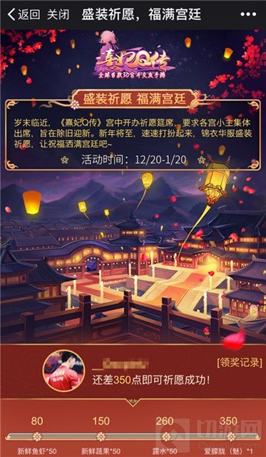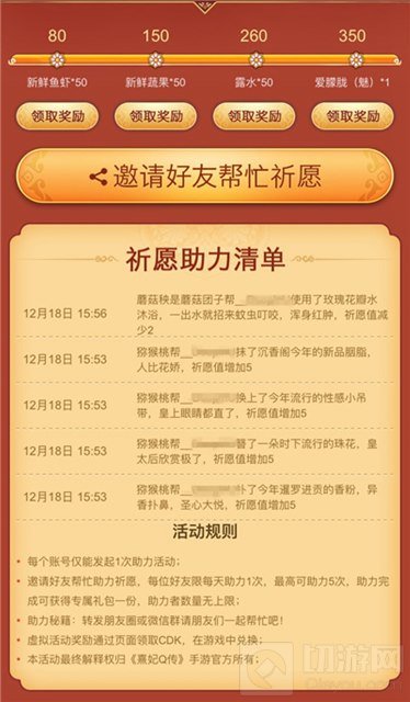 *当发起活动者祈愿值达到80/150/260/350时,获得相应礼包;