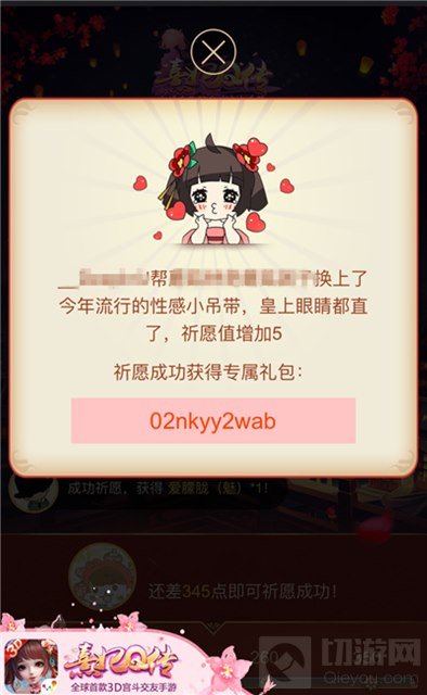当然了,大家都知道,自古君王皆喜怒无常深不可测,所以每一位助力者为小主的祈愿值所做的贡献是不固定的哦。若是助力者为小主簪了皇上喜欢的宫花一朵,小主的祈愿值便会增加5,若是皇上闻见了令他过敏的花粉,小主的祈愿值则会减少2。所以,赶紧召集欧气冲天的朋友帮忙助力,才能早日攒满祈愿值,为苍生祈福!