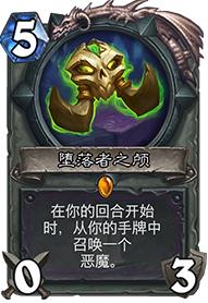 堕落者之颅看似很适合恶魔术,不过如今纯恶魔术并不强力。堕落者之颅的问题在于回合开始时生效,也就是5费是空过的,6费回合召唤恶魔并不能行动,除非召唤出冲锋5-7大哥或者虚空领主这样好身材随从才能发挥作用。
