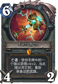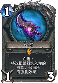 另一张不怕小软的卡牌,亡语是给手牌中的随从BUFF,随从死亡又自动装备,无限循环使用。所以,有时候还巴不得对面使用小软,好加快利用这把武器的亡语效果。