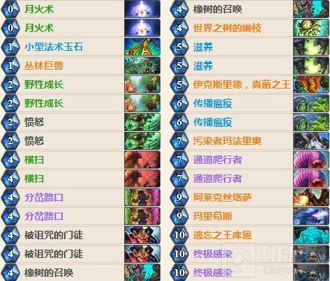 我们起手找跳费和解牌,小型法术玉石、愤怒、野性成长、滋养都可以留,对上快攻卡组可以留分岔路口和传播瘟疫;对上控场卡组时可以留橡树的召唤、橙武。这套卡组唯一的问题是过牌比较依赖终极感染,要是前期跳费用掉了滋养后面找核心牌可能需要一点点时间。但总的来说,这还是一套好玩又有强度的卡组。