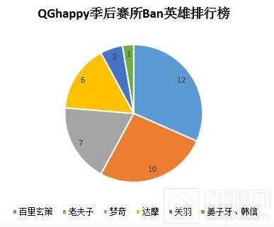 接着我们再来看,季后赛QGhappy在比赛中所Ban英雄的一个排行数据。两场比赛13局,百里玄策的12次几乎是逢打必Ban,清野快、入侵强、勾中必死。其次是10次居多的老夫子,夸张的是,没被Ban掉的三场比赛,QG都是在蓝色方优先选掉,毕竟边路1打2,且打团有奇效。梦奇这名英雄,肉、回复快、伤害足、且能突进或收割,与苏烈基本是一个梯度。达摩虽然Ban了6次,但主要是对阵JC的6场,对阵XQ的Ban率应该极低。