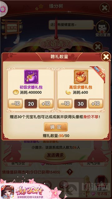 求婚礼包分为初级和高级两种,初级求婚礼包只消耗金币,高级求婚礼包消耗元宝。赠礼的数量上限为50个,当赠送元宝礼包达到30个的时候,更可达成成就,获得“身价不菲”头像框和“同林鸟”印记。既然想求得佳人进门,必然要出手大方,不是吗?