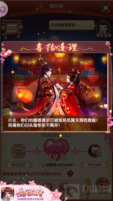 在结成夫妻关系之前,两方必须先结成红颜知己,并且当亲密空间的情缘值达到LV8之后,才可开启求婚。求婚方式分为“私定终身”和“三媒六聘”两种,选择“私定终身”的两方只需相互同意即可结为夫妻,选择“三媒六聘”的小主们就需要下聘书,送聘礼,热热闹闹大操大办啦。