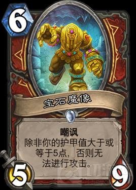 很多玩家觉得这张卡不强,虽说有5/9身材,但却无法攻击,而5点护甲在竞技场中是难以攒到的。事实上并非如此:一来它带有嘲讽效果,而且不吃沉默,对手必须解掉它才能够继续对我方随从造成威胁;二来战士新版本出了许多配合牌(比如前面提到的未鉴定的盾牌),未必不能叠到5点护甲。面对牧师等可能有点吃紧,但对阵猎人、圣骑士等铺场型职业,将大大消磨其进攻势头,建立起己方场面优势。