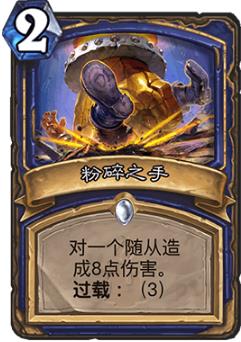 这里着重吹一下新白卡:粉碎之手,有些主播的过载萨没带这张卡,而是换成了闪电箭或者雷暴术,在我看来是非常不明智的。我一定要吹一下,这张卡在过载萨套路里就是一张满分卡!萨满硬解只有两张妖术,衰变对高费卡无力,闪电箭青玉闪电这些直伤连解5血生物都很费劲,以前版本萨满经常出现断解的情况,只能靠生物攻击力,亏卡亏场面也不适合控制卡组。