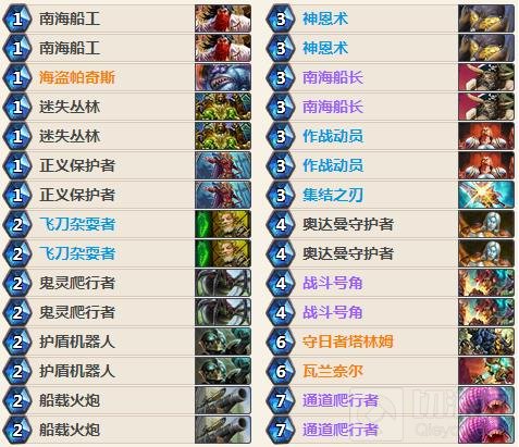 与标准不太相同的是狂野加入了奥达曼守卫者,护盾机器人,作战动员这种非常imba的职业牌,以及鬼灵爬行者这种当年快攻必带的一张牌。这些卡牌都是前期能力非常强的卡牌,飞刀配合作战动员以及飞刀配合鬼灵都有极好的效果。奥达曼守护者,也可以限制敌方大哥。