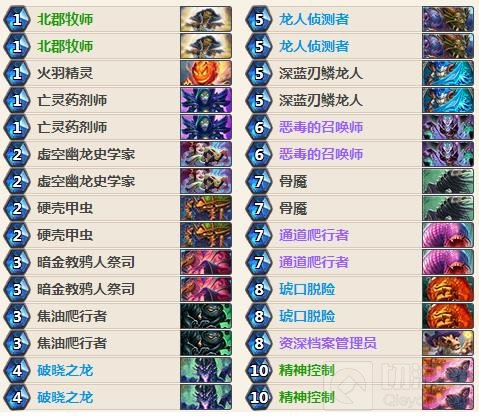 我们起手找北郡牧师、硬壳甲虫和暗金教鸦人祭司,尽量抢占场面。对上快攻卡组时留破晓之龙,最好能配合虚空幽龙史学家;对上控场卡组时手牌好的话可以留龙人侦察者、深蓝刃鳞龙人。