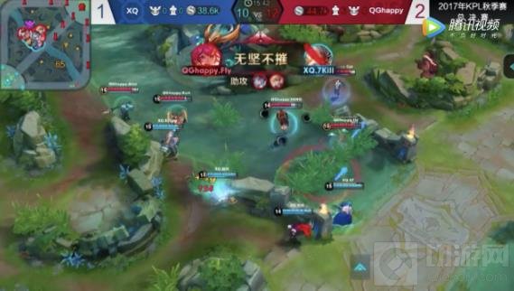 在对阵XQ的首局比赛里XQ拿出白起、达摩边路,诸葛亮打野,可谓”四七“连线,QGhappy拿出花木兰、杨戬双边路,李元芳打野的常规体系。前期双方在第一条暴君处爆发团战,杨戬运用一技能“逆转乾坤”频频命中敌方核心,开局就拿下三连决胜并配合队友团灭XQ;中后期QGhappy抓住前期的优势,利用李元芳的速推体系快速清线,打赢几波团战后经济遥遥领先,XQ节节败退,QGhappy拿下暴君后带着BUFF加成冲上高地,一波推平水晶。