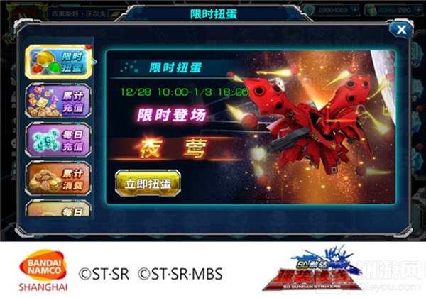 为了庆祝2018年的到来,从12月30日10:00起至1月1日23:59,除了每日登陆游戏可以获得补给箱钥匙以及10W金币的奖励,更开放了所有困难关卡第二关和第四关的双倍金币获得,同时SSR敢达试作2号机的碎片也已经开放掉落,玩家可以在所有困难关卡的第三关以及第六关来完成收集。