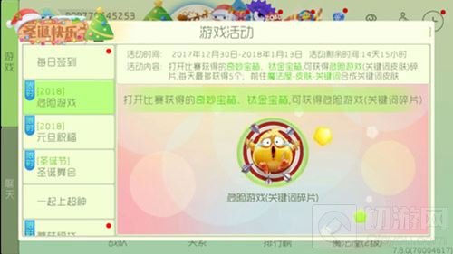 本次活动的时间在2017年12月30日~2018年1月13日,打开比赛获得奇妙宝箱或者钛金宝箱,可以获得危险游戏(关键词皮肤)碎片,每天最多可以获得5个。