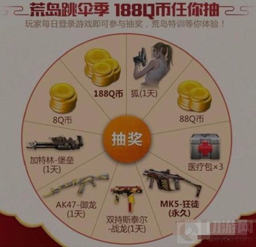 玩家每天登录游戏就可进行荒岛跳伞季抽好礼活动,玩完荒岛特训来抽188Q币,注意这个活动与玩荒岛特训集字兑换188Q币的活动并不冲突哦,当然能抽中永久MK5-狂徒也不赖。
