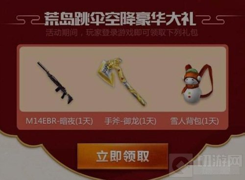 首先是荒岛跳伞空降豪华大礼活动,活动期间,玩家登录游戏即可领取M14EBR-暗夜(1天)、手斧-御龙(1天)、雪人背包(1天)。