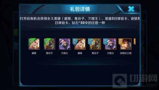 荣字礼包:有机会开出虞姬、鬼谷子、兰陵王三个永久英雄和他们的英雄、皮肤体验卡。