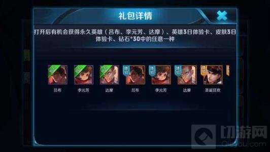 耀字礼包:有机会开出吕布、李元芳、达摩三个永久英雄和他们的英雄、皮肤体验卡。