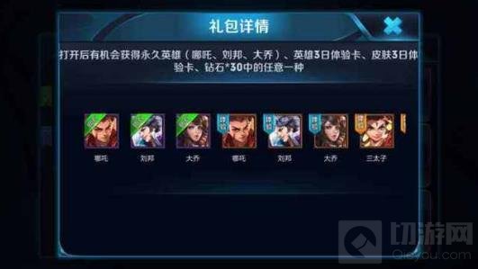 飞字礼包:有机会开出哪吒、刘邦、大乔三个永久英雄和他们的英雄、皮肤体验卡。