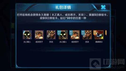 车字礼包:有机会开出太乙真人、成吉思汗、关羽三个永久英雄和他们的英雄、皮肤体验卡。