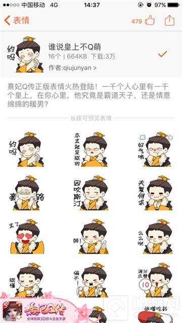 要说《熹妃Q传》的小主们在这宫里每天聊天解闷的最中意对象,莫过于慕凌辰了。试想,这位大楚皇帝日理万机,若能得到他在繁忙政务中的一分青睐,简直就是嫔妃的无上荣耀。一千个人心里有一千个皇上,他在你心里,究竟是霸道天子,还是情意绵绵的暖男?现《熹妃Q传》与搜狗输入法强强联手,推出定制Q萌皇帝表情包,小主们赶紧用起来吧!
