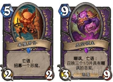 5费2/2招募,相比过去的空灵召唤者,强大之处在于招募和从手牌拉比更稳定,不需要手中有恶魔,相当于免费抽一张且不支付费用,关键在于如今有了虚空领主这张万里长城,一卡=4张墙,稳定控制拉出来以后相当于5费一个2/2,一个3/9嘲讽和3个1/3嘲讽,强到爆炸,只怕牧师把2/2沉默或者拐卖,如今这个combo在环境中也是极为变态的,各种快攻遇到3/9以后基本都缴械投降了。变态指数3颗星。