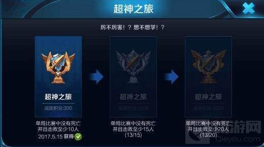 这个超神之旅的最高成就就太难了,除了玩小号,在自己段位能杀到20人不死绝对的大神!