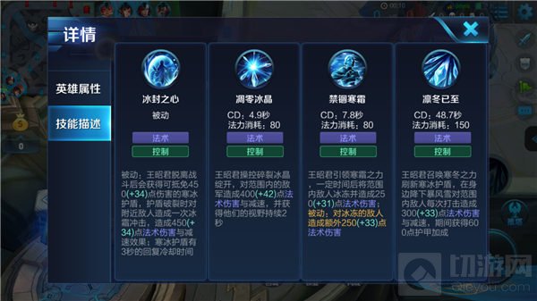 王昭君在脱离战斗后会获得可抵免伤害的寒冰混沌,混沌破裂时对周围敌人造成一次冰霜冲击造成法术伤害并附带减少移动速度效果,寒冰护盾在短时间内就能获得一次,这个被动对于王昭君这样的脆皮法师来说,在前期能够更好的保护自身,同时护甲破裂时对皱纹的敌人造成伤害并减速,配合之后二技能的被动效果,打得对说毫无游戏体验。