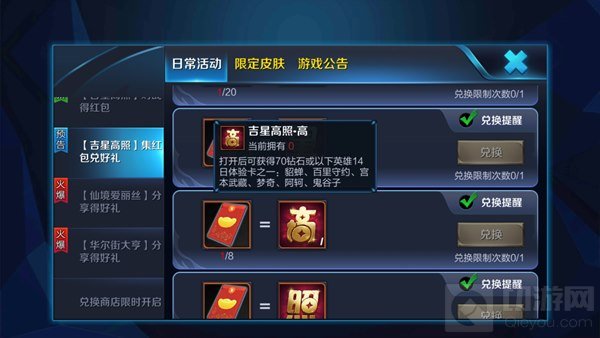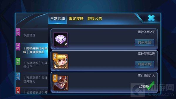 首先比较简单的获得方式就在游戏活动中领取,每次登陆游戏时会自动打开游戏活动界面,如果关了也可以点击游戏大厅界面右侧的活动按钮打开。打开活动界面后在活动中找到可以获得英雄皮肤体验卡的活动,满足条件后领取就可以了,这一类活动一般很好完成。